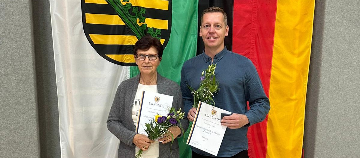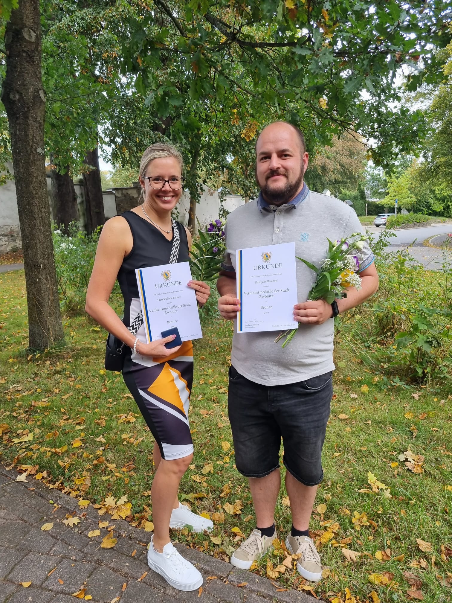Für ihre jahrelange ehrenamtliche Tätigkeit im TSV Brünlos erhielten Stafanie Becher und Jens Drechsel am 03.10.2023 die Zwönitzer Verdienstmedaille in Bronce.