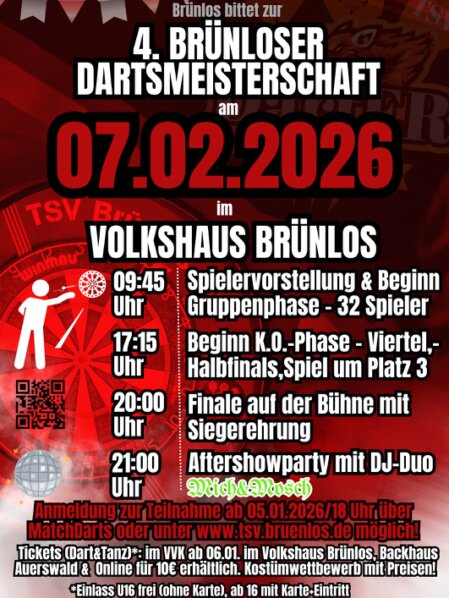 Der Ticketverkauf für Zuschauer ist auch in diesem Jahr wieder im Backhaus Auerswald sowie im Volkshaus Brünlos ab dem 06.01.2026 möglich. In diesem Jahr ist auch der Online-Kartenverkauf auf der Homepage unter Abteilungen/Dartsevent wieder möglich. Hier können Karten zzgl. Porto Online gekauft und direkt an euch Versand werden. Zahlung per Paypal. Karten werden zu einem Tagespreis von 10€ für Zuschauer zur Verfügung stehen. Kostümierte Zuschauer sind dabei sehr gern gesehen. Das Beste Kostüm wird in der Pause vor den Halbfinals mit einem Scheck i.H.v. 50€ gekürt. Zusätzlich erhält in diesem Jahr das Beste Gruppenkostüm eine Auszeichnung. Gute Stimmung vorprogrammiert.